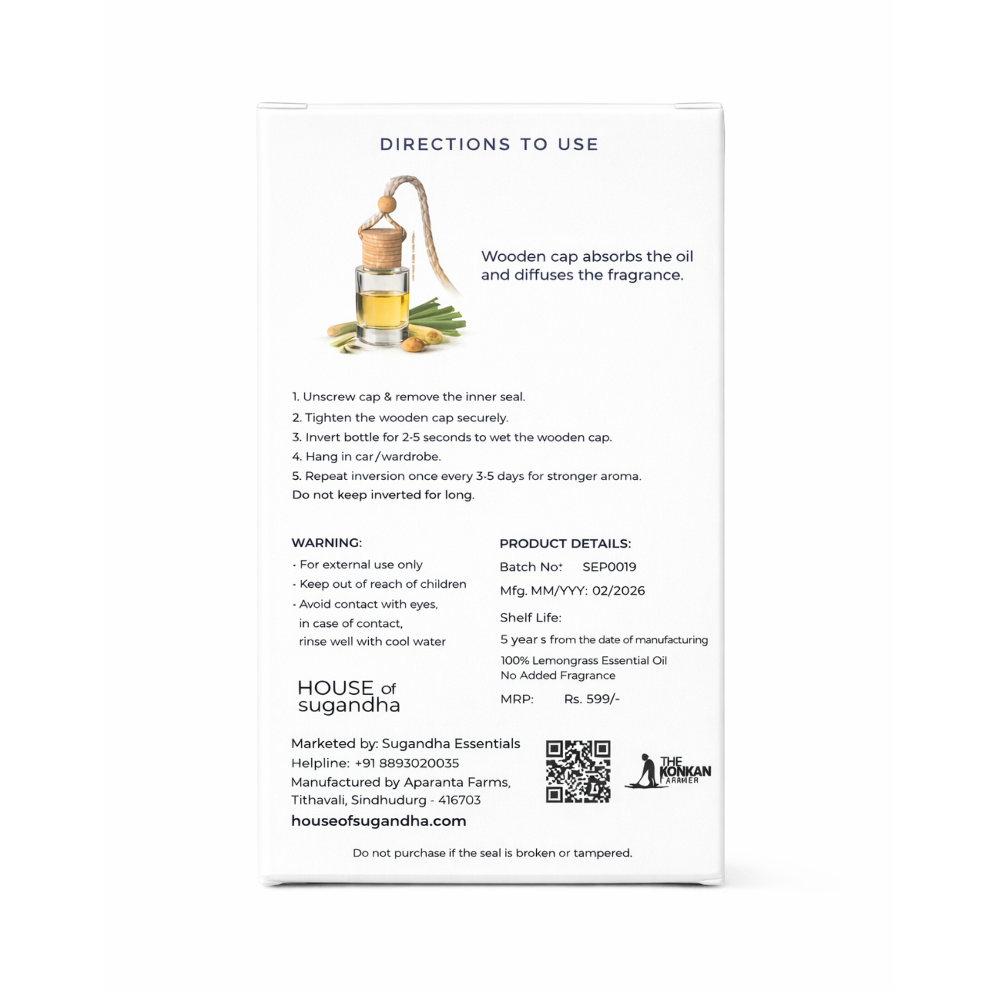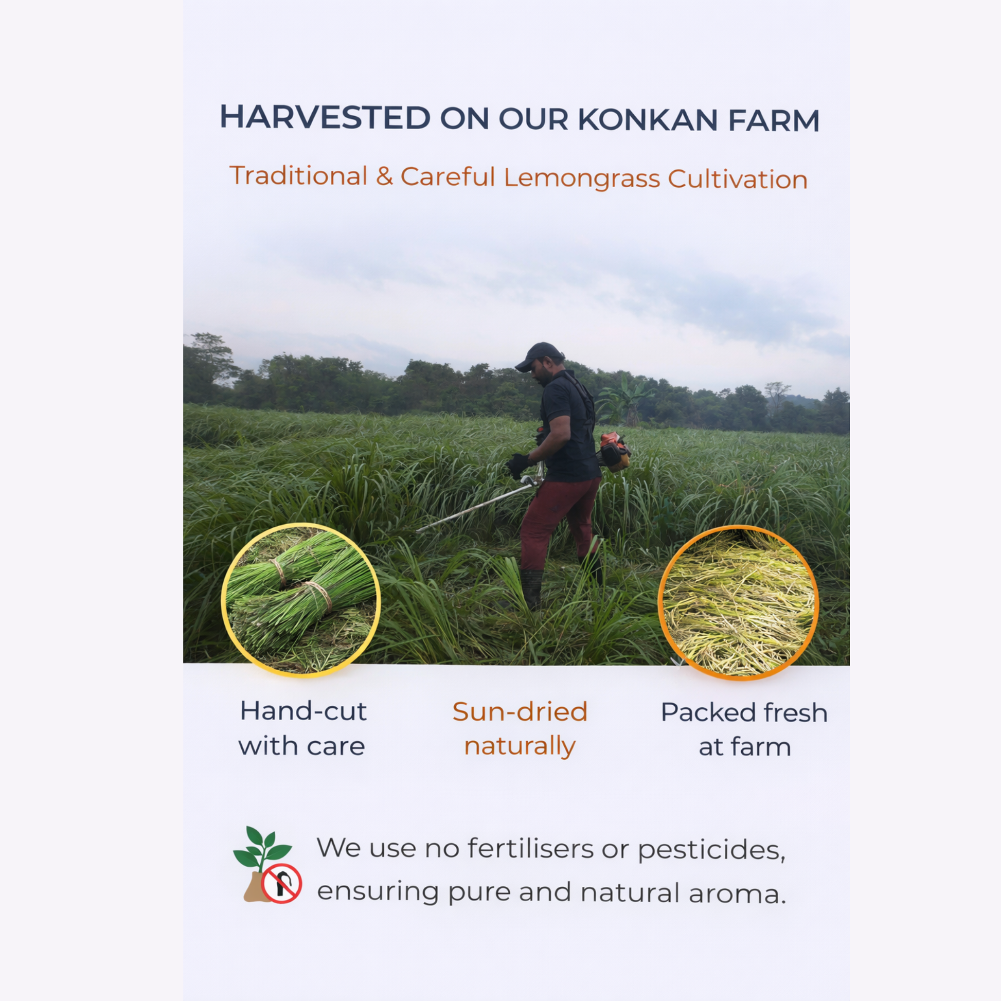 - 100% natural lemongrass essential oil Made using pure lemongrass essential oil steam distilled in small batches at our Konkan farm, offering a clean, refreshing lemon aroma without synthetic fragrance or chemical solvents.